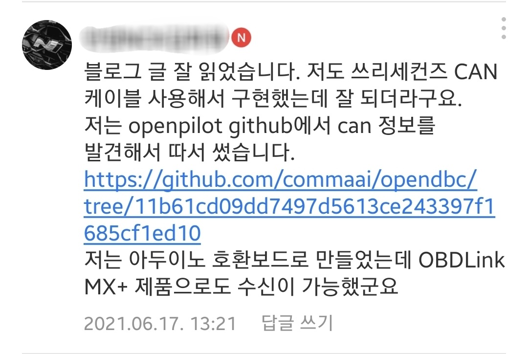 이런 댓글이 달렸다. 해당 링크는 https://github.com/commaai/opendbc 여기를 가리키고 있었고
