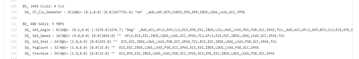 SG_ SAS_Angle : 0|16@1- (0.1,0.0) [-3276.8|3276.7] "Deg" _4WD,ACU,AFLS,AVM,CLU...ETC...