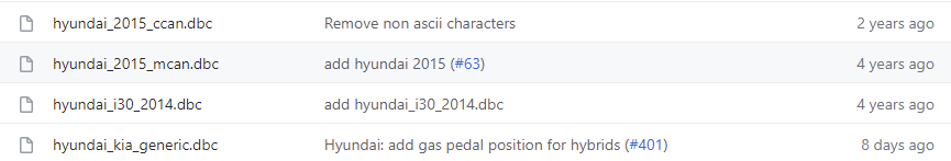 그리고 혹시나 다른 차종이 추가된 OpenDBC는 없나해서 OpenPilot의 Fork를 찾아보다가 한 포크에서 Veloster JS의 CAN ID List도 찾아냈다.