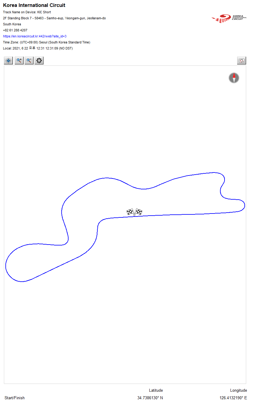 그러면 이렇게 뜰 텐데 저 빨간색 위치표시가 우리가 검색했던 좌표이다. 물론 표기가 도분초 단위로 나와서 저렇게 나오는데 일단은 저기가 맞다. 가본 서킷은 영암 상설 밖에 없어서 계측선이 어딘지 잘은 모르겠으나 딱 봐도 뭔가 체크플래그 같은 저 선이 계측선일 것 같고 우리가 찍은 좌표도 저기에 가깝다.