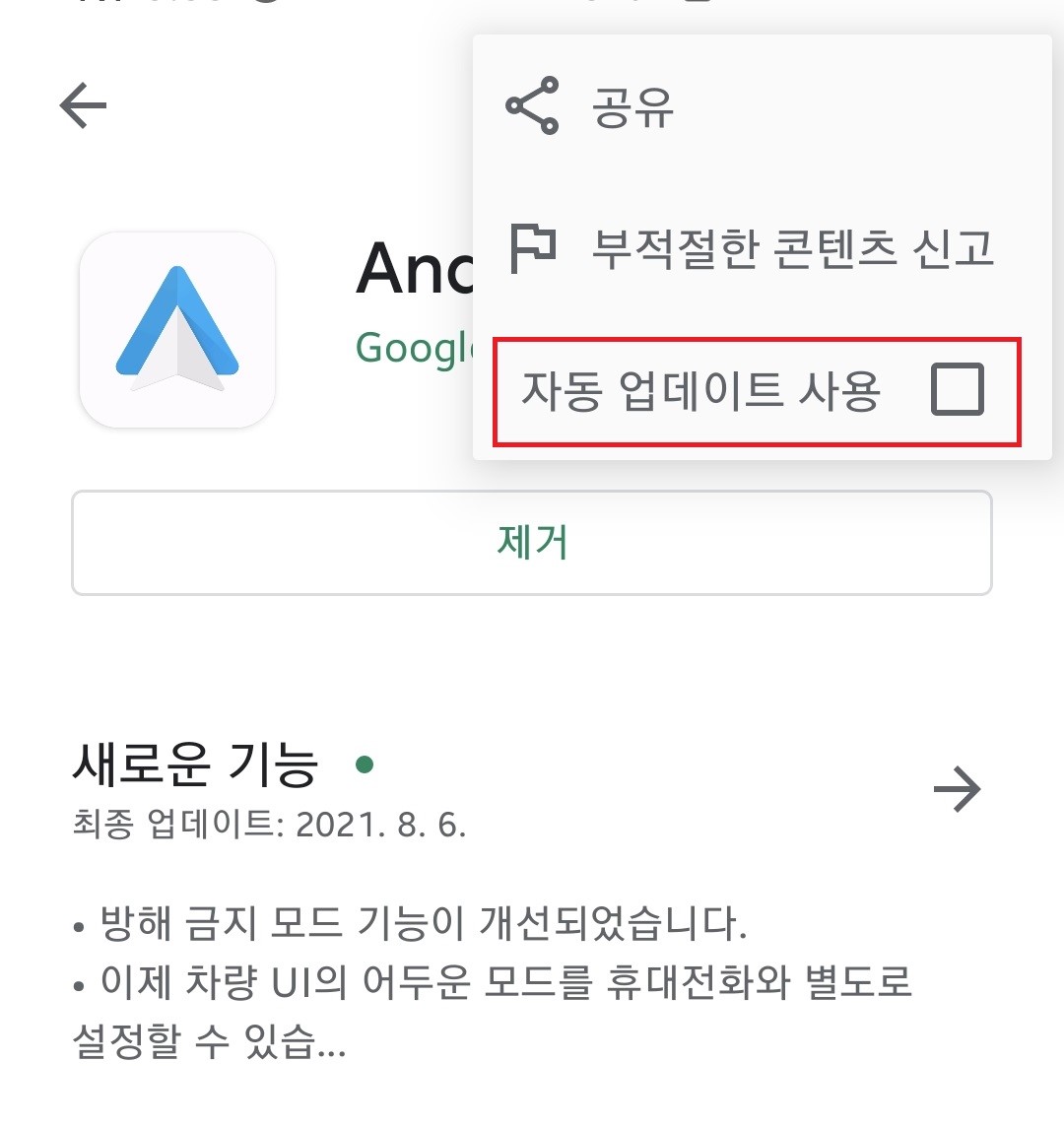 그리고 해당 솔루션을 계속 사용하시려면 안드로이드 버전이 바뀌는 업데이트를 미루고 플레이스토어 안드로이드 오토 페이지에서 앱의 자동 업데이트 사용을 체크 해제하신 후 AAAD의 Issues 페이지에서 작동 여부를 확인하시고 업데이트하시기를 추천드립니다.