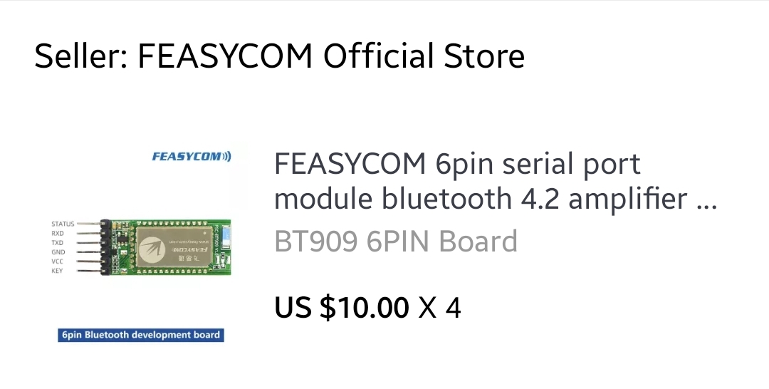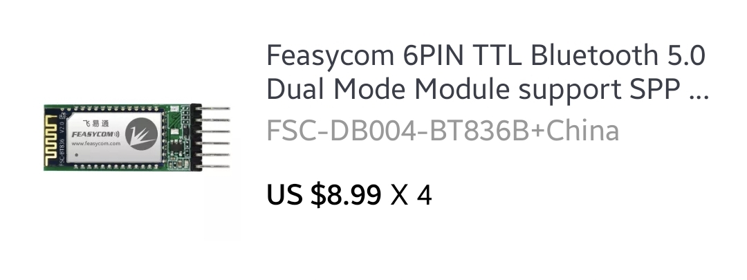 그리고 블루투스 모듈은 저기 링크에서는 HC-05를 사용했지만 HC-05가 찾아보니 bluetooth 2.0이더라 이것도 최신 칩셋으로 쓰고싶어 찾아보다가 알리익스프레스에서 Feasyscom이라는 메이커에서 Bluetooth 4.0, 5.0 모듈을 팔고있더라 핀도 HC-05호환이라 바로 구매를 했다. 물론 HC-05보다는 조금 비싸긴 했으나 그냥 주문했다.