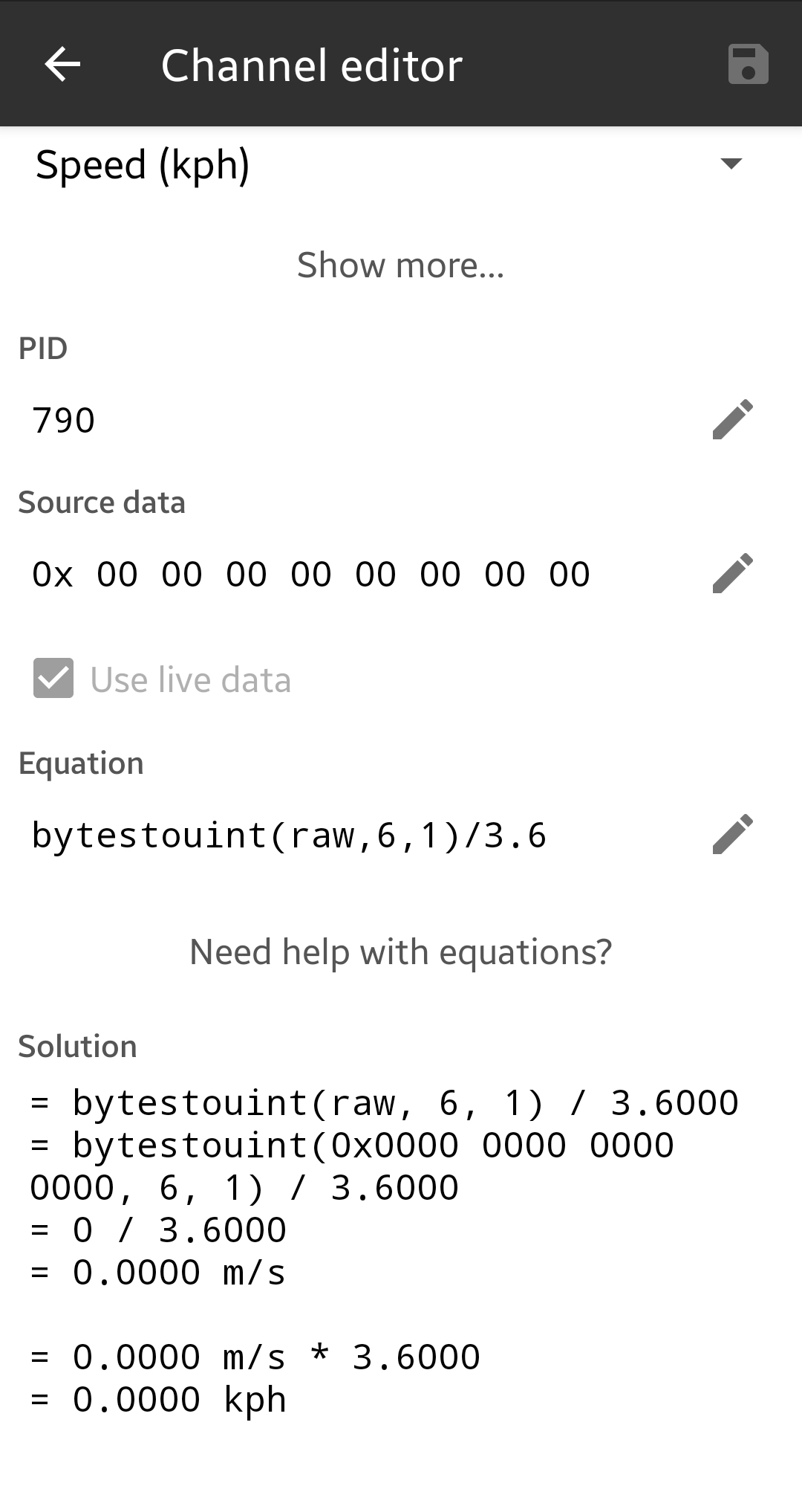그런데 스피드 같은 경우에는 원래부터 kph로 날아옵니다. 그걸 레이스 크로노에서는 자동으로 m/s로 해석해서 kph로 변환하는 바람에 값에 3.6이 자동으로 곱해집니다. 그래서 계산식에서 나누기 3.6을 해주셔야 합니다.