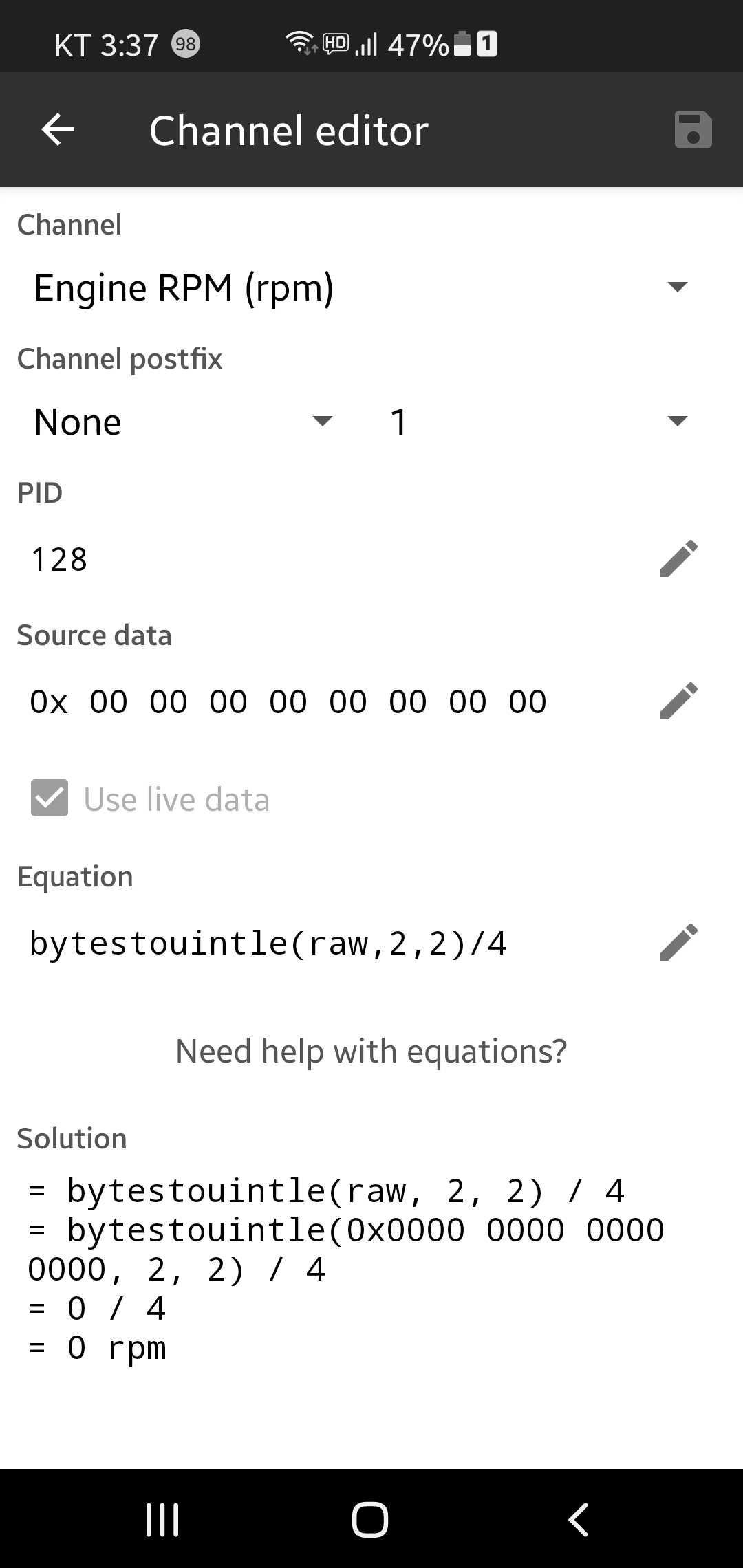레이스 크로노에 등록하는 방법은 예를 들어 pid 128 Accel Pedal Position인 경우