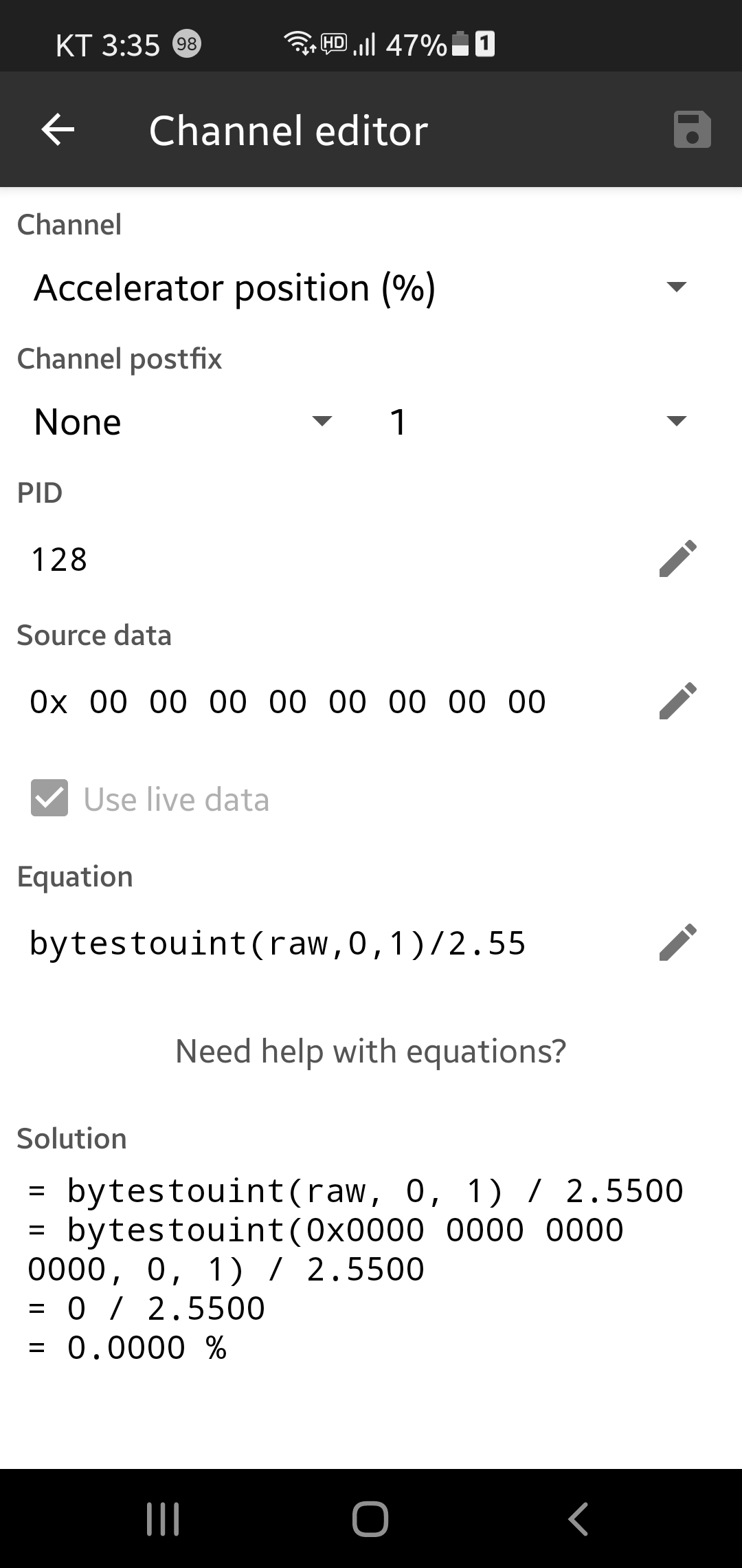 레이스 크로노에 등록하는 방법은 예를 들어 pid 128 Accel Pedal Position인 경우