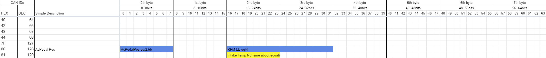 C-CAN HEX,DEC,Simple Description,0th byte,1st byte,2nd byte 0~8bits,8~16bits,16~24bits 0,1,2,3,4,5,6,7,8,9,10,11,12,13,14,15,16 40,64 42,66 43,67 44,68 7F,127 80,128,AcPedal Pos,AcPedalPos eq/2.55,RPM LE eq/4 81,129,Intake Temp Not sure about equation *0.6
