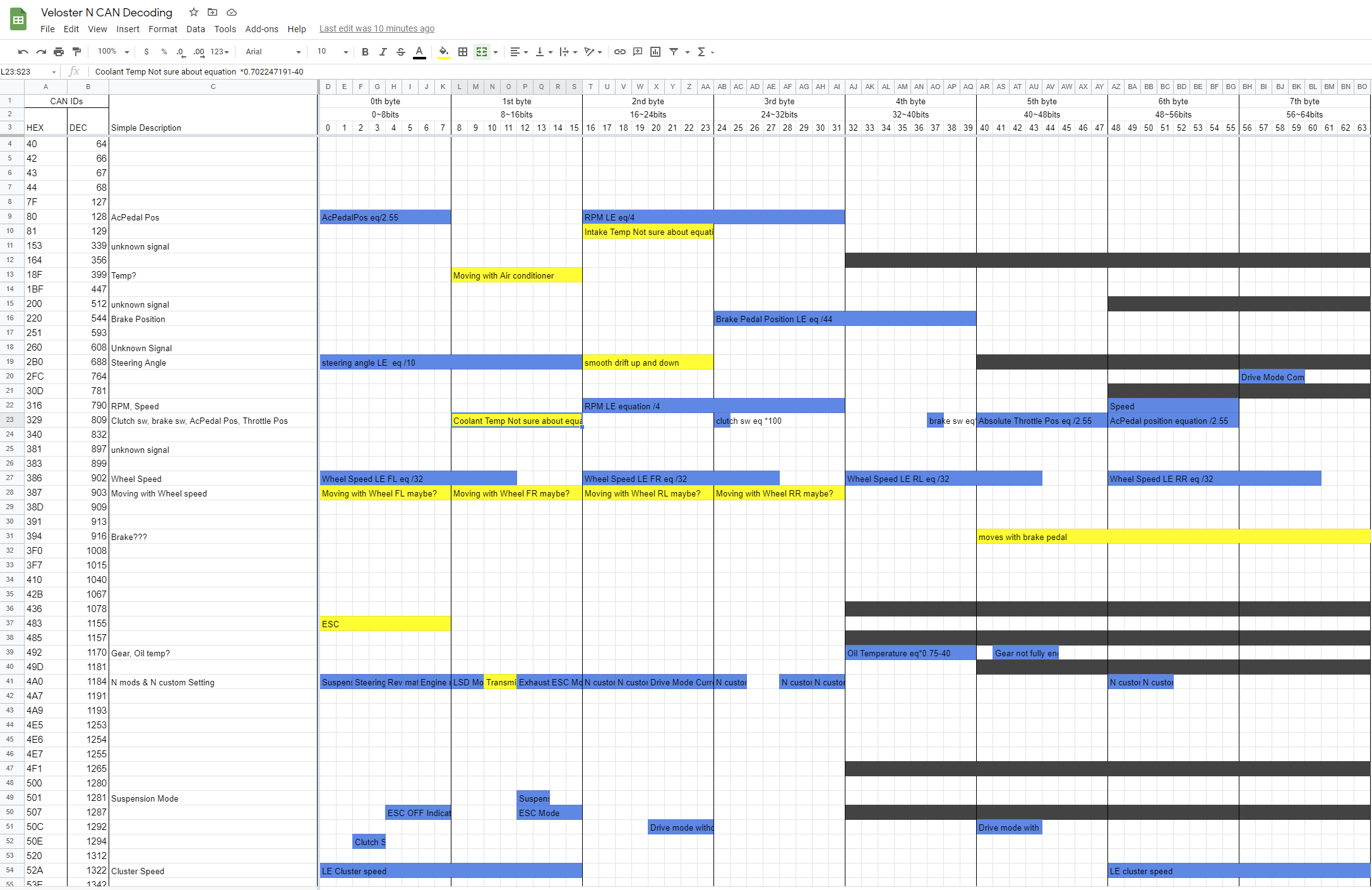 하지만 벨로스터N 수동 모델 같은 경우엔 제가 디코딩을 어느 정도 해놓았으니 정확하진 않은 값이라도 필요하시면 쓰세요.(일단은 수동 모델에만 적용해봐서 그런데 아마도 몇몇 값은 DCT에도 사용이 될 거라고 생각은 하고 있습니다.)