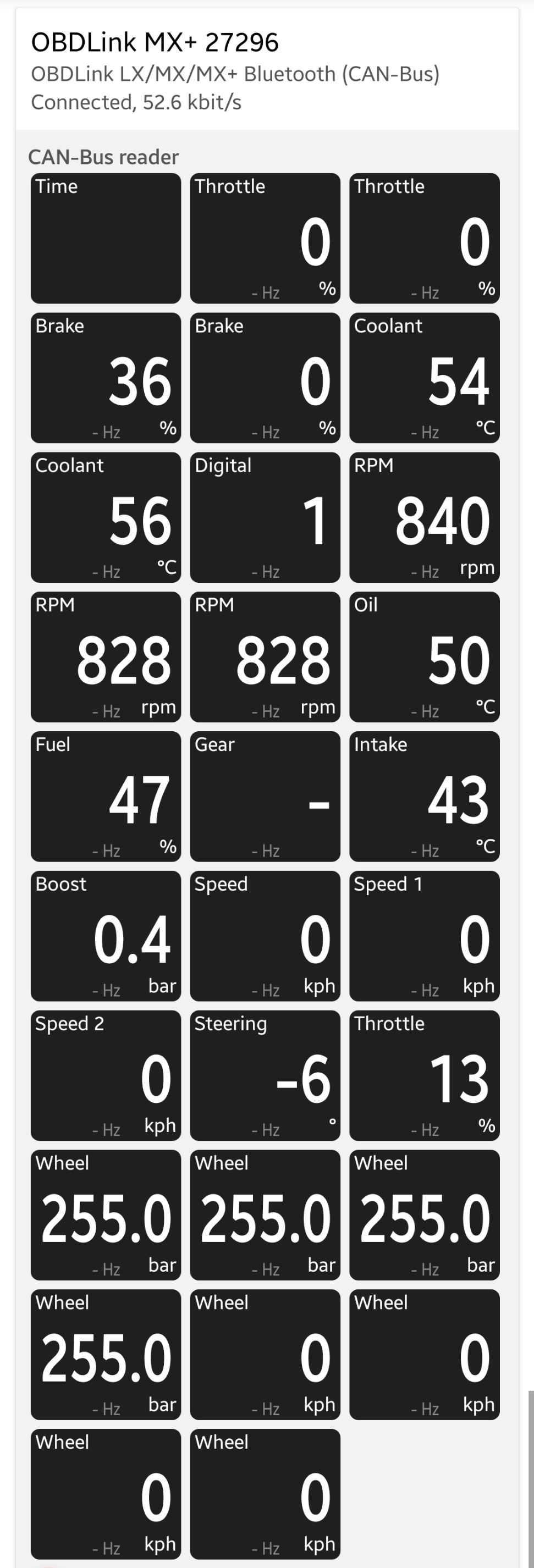 레이스 크로노에 위의 프로파일을 등록하시면 위의 사진과 같이 CAN을 통한 데이터 로깅이 가능합니다.